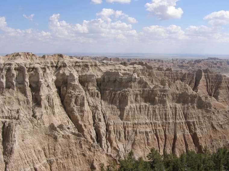 Located in southwest South Dakota, Badlands National Park highlights a stark contrast between the flat prairie of the Great Plains and thousands of sharp ridges, narrow ravines, and tall spires. The park earned its name from the Lakota people who called it “mako sica” or “land bad”, and from French-Canadian fur trappers, who called it "les mauvais terres pour traverse," or "bad lands to travel through." The area was initially renown for its mammalian fossil beds and was first designated a national monument in 1939 (it became a national park in 1978).