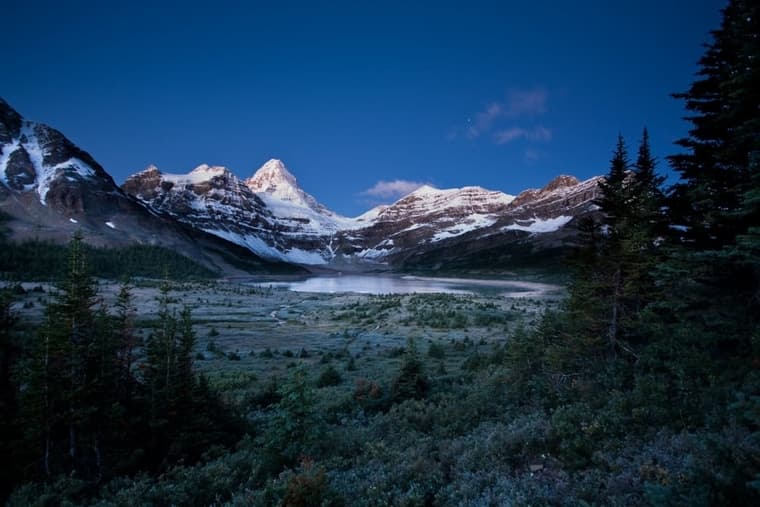 The 11,870-foot Mount Assiniboine along the Continental Divide border of British Columbia and Alberta—and the boundary between Banff National Park and the roadless Mount Assiniboine Provincial Park—may well be the most spitting of the Matterhorn’s North American spitting images.